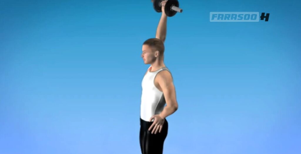 در این حرکت چند مفصلی، دستان بالای سر قرار میگیرد و با توجه به این فرم خاص فشار متفاوتی را روی عضلات سه سر بازویی (پشت بازو) بخوصوص سر داخلی عضله سه سر بازویی دارد، ساعد، دلتوئید (سرشانه) و دندهای از عضلات کمکی در این تمرین هستند.